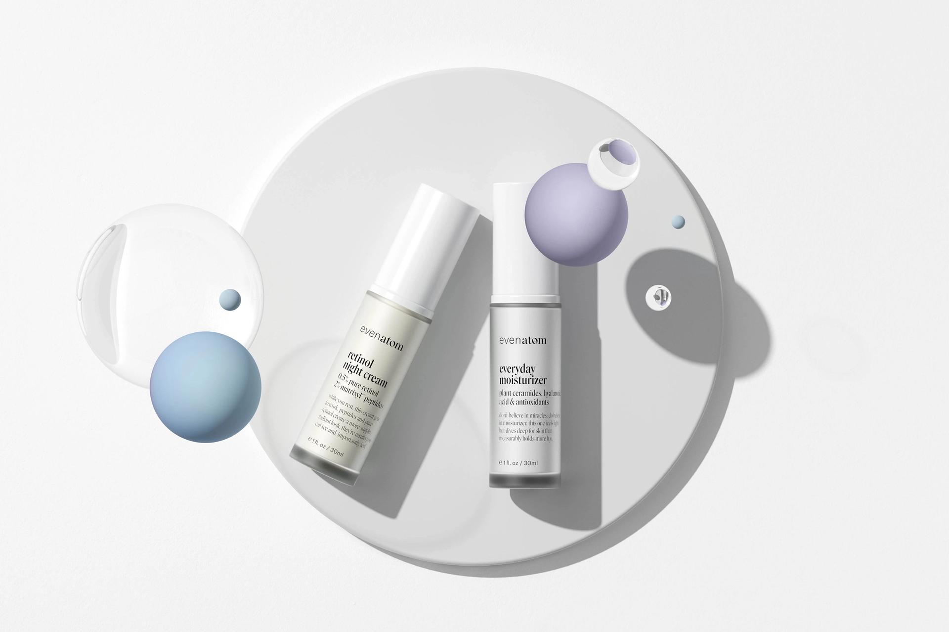 Even Atom is a skincare brand that aims to provide products backed by science but touched by humans. Each product is designed to look clinical, but with a touch of identifying colour — humanity.