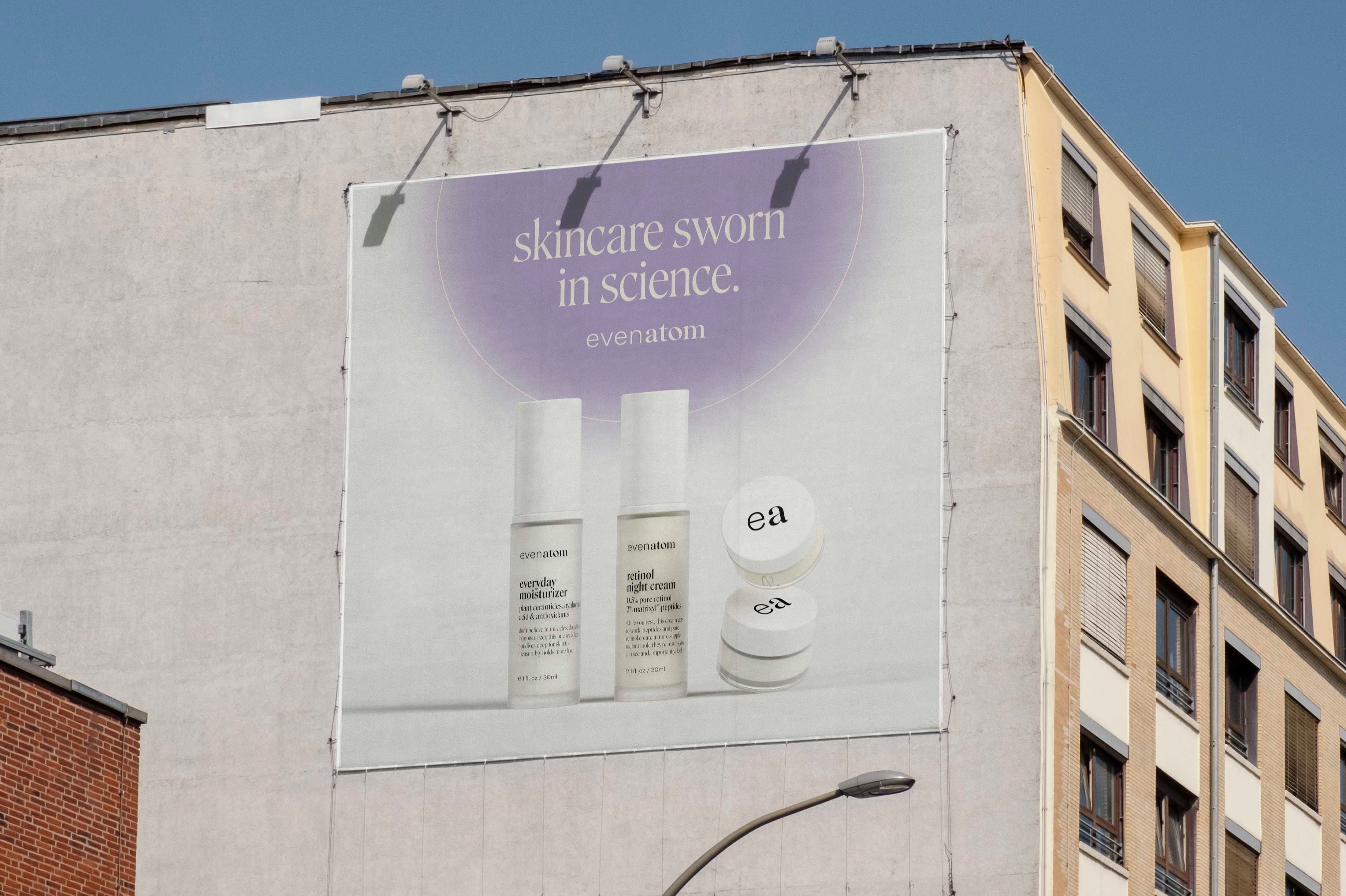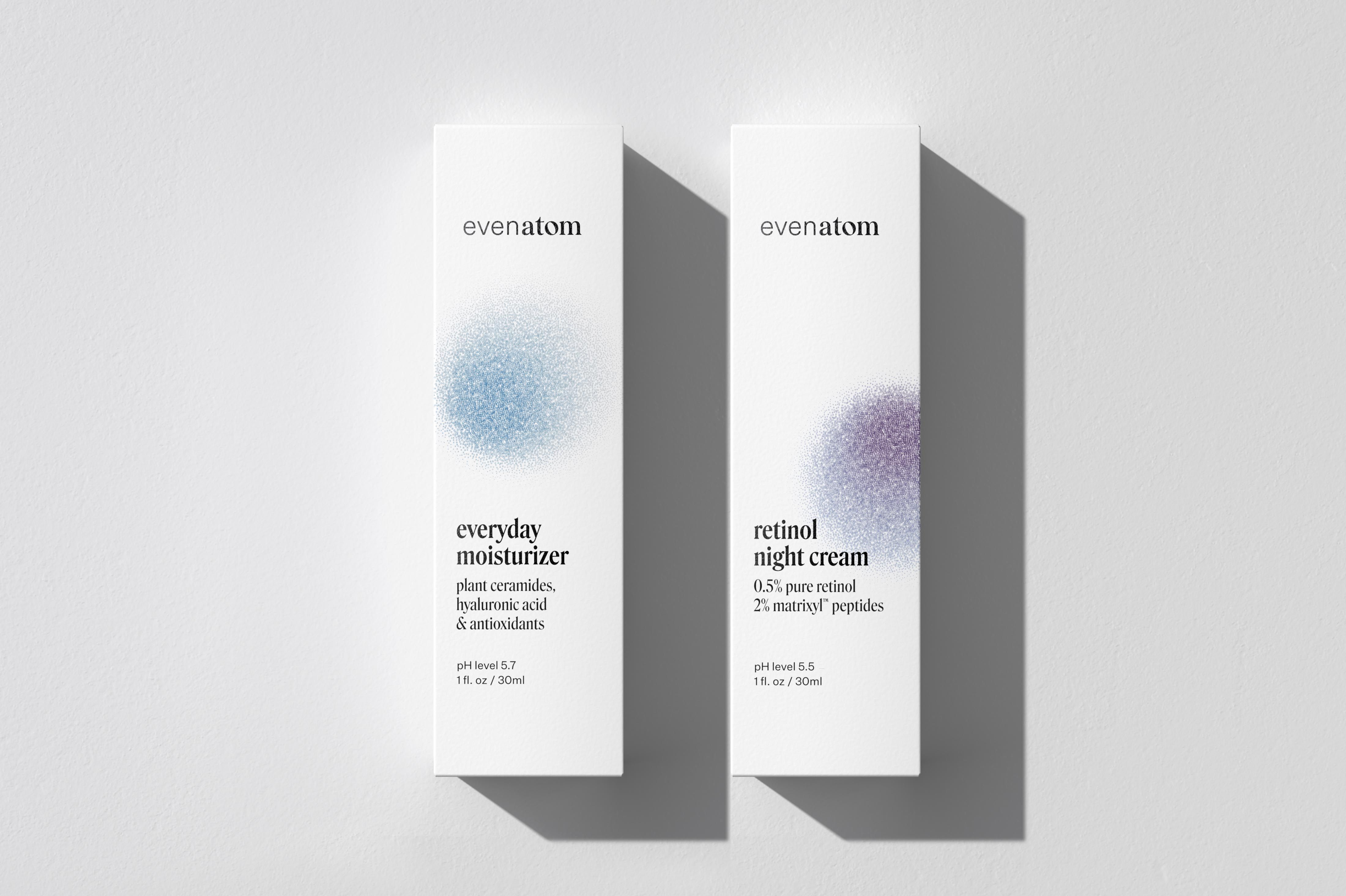 Even Atom is a skincare brand that aims to provide products backed by science but touched by humans. Each product is designed to look clinical, but with a touch of identifying colour — humanity.