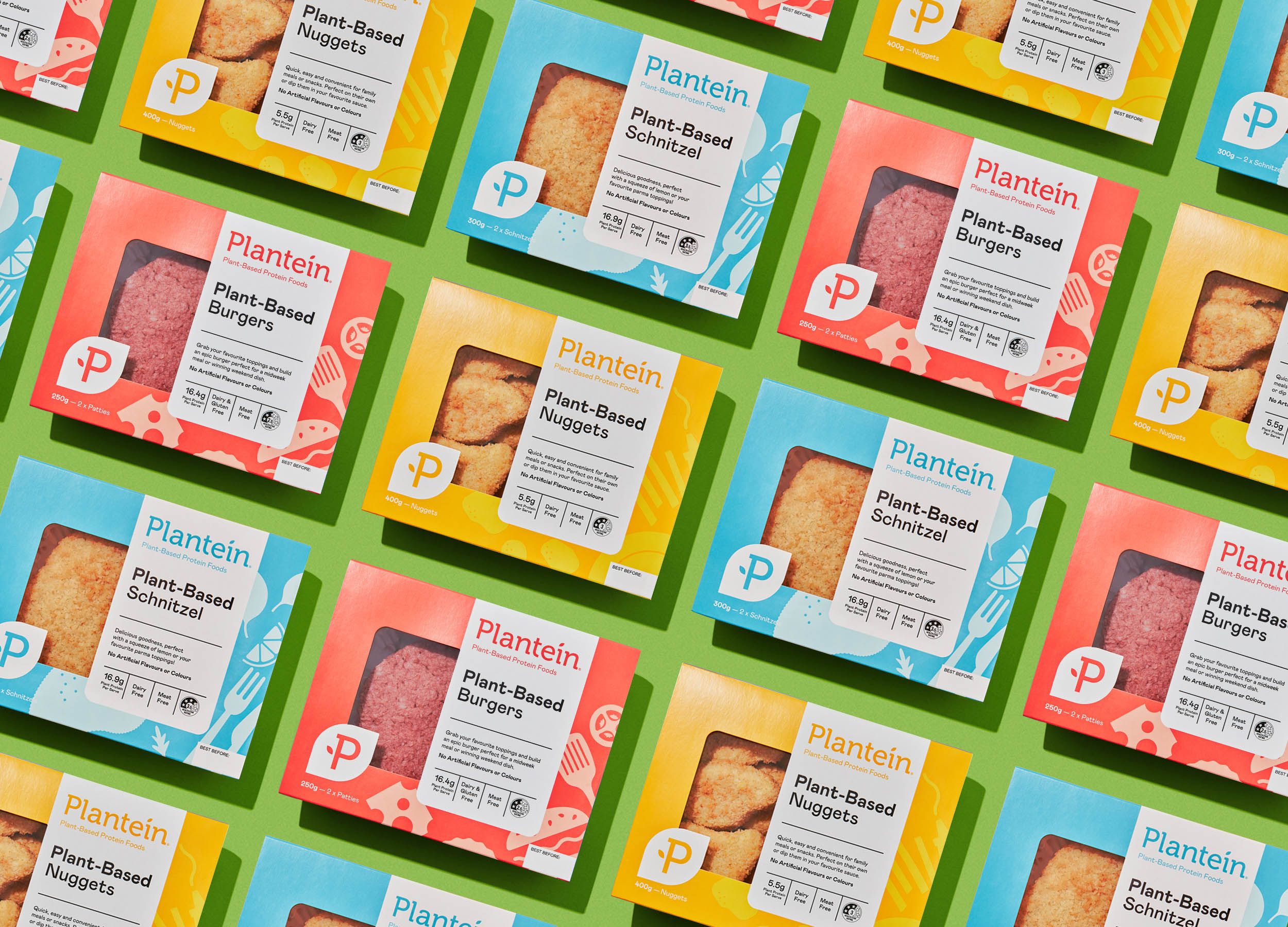 Plantein is a range of meat-free plant-based alternatives built on incredible taste and texture and aimed at the fast-growing 'flexitarian' market. In a marketplace already crowded with meat-free alternatives, it was important that Plantein would stand out against its competitors. With a bright and appealing brand identity, we positioned Plantein to stand out from the crowd and distinguish itself as a plant-based product rather than simply blending into the meat category. Tied with fun and quirky photography and illustrations, the brand has a cohesive and identifiable look that’s impossible to miss on the supermarket shelf. Which is exactly how we wanted it.